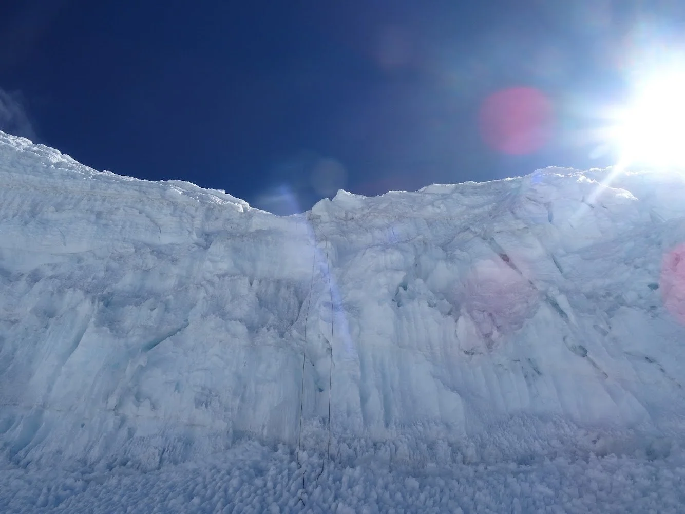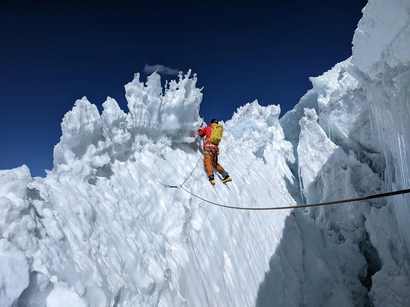 Ich steuerte entschlossen auf die Stufe zu und berichtete Niklas von meiner Idee. Nachdem er mir seinen Segen zusprach, kletterte ich die ersten Meter einer Seillänge, die ich nie wieder vergessen werde. In der Vertikalen fühlte ich, wie meine Muskulatur unter dem Sauerstoffmangel, verursacht durch die Anstrengung der Kletterei in dieser Höhe, förmlich leergesaugt wurde. Nach einer Eisschraube nach den ersten drei Metern, verzichtete ich auf weitere, regelmäßige Zwischensicherungen. Das eindrehen der Schrauben hätte mich körperlich an meine Grenzen gebracht. Um die Dramatik perfekt zu machen, vollzog sich dieses Spektakel im roten Licht der aufgehenden Sonne. Oben angekommen dachte ich zunächst, dass alles umsonst gewesen sei. Ich erkannte einen weiteren Abgrund hinter der Kante. Zu unserem Glück hatte sich in der Kluft genügend Schnee gesammelt, wodurch die Überquerung der Spalte mühelos möglich war.