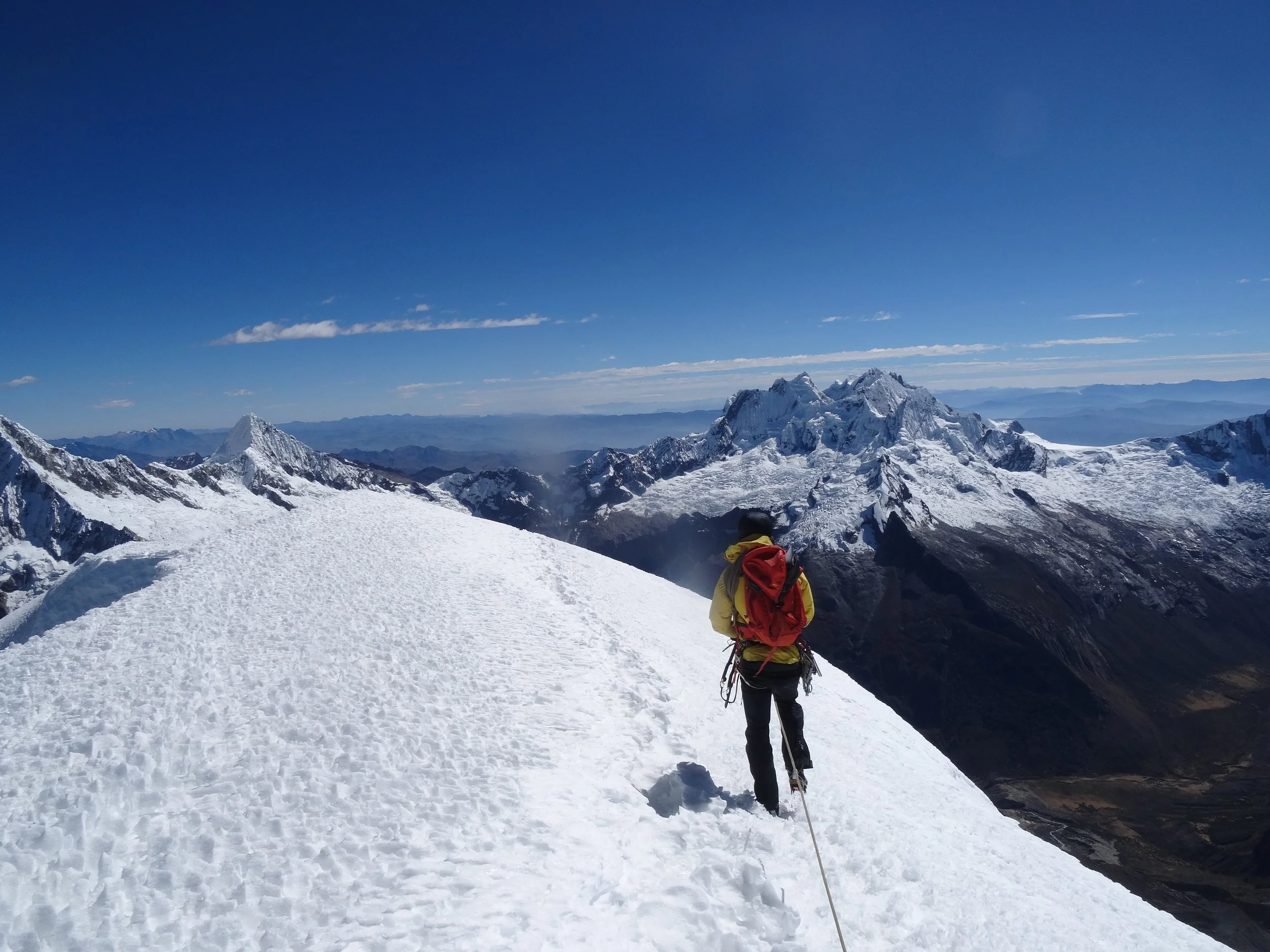 Wir überwindeten eine Hand voll wundersamer Eispilze und erreichten bald flacheres Gelände. Die letzten Meter am Grat konnten wir im einfachen Gehgelände beschreiten. Auch wenn unsere Pumpen in dieser Höhe eifriger denn je arbeiteten, fühlten wir uns innerlich wohl. Um 09:30 saßen wir am Gipfel des 6025m hohen Artesonraju. Wir stärkten uns mit Tee und einer Hand voll sauren Gummiwürmchen, die Niklas für diesen besonderen Moment mitgebracht hatte. Ehe wir an den bevorstehenden Abstieg dachten, genossen wir die außergewöhnlich schöne Aussicht auf diesem fast freistehenden Berg.